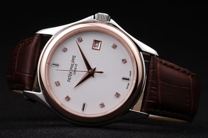 Bracelet de acero inoxidable: correa de piel de cocodrilo marrón con relieve de calor Sello Patek Philippe y 18k oro rosa gancho plateado corchete -buckle con Patek Philippe engraving