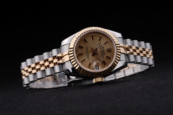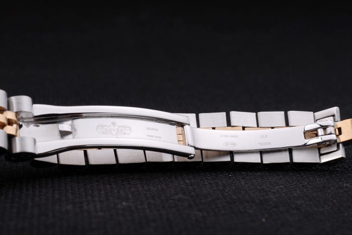 Bracelet de acero inoxidable: Dos brazalete de eslabones de tonos de acero inoxidable pulido y oro amarillo de 18K chapado en acero con cierre oculto grabado Rolex mostrando la longitud Rolex logo