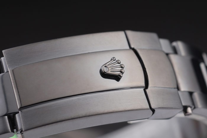 Bracelet de acero inoxidable: enchapado en ion brazalete de eslabones de acero inoxidable con Rolex grabado plegado en el cierre desplegable que muestra la longitud Rolex logo