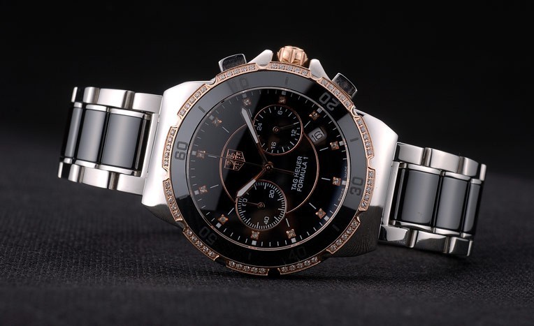 Crown: rosa de 18 quilates chapado en oro de la corona calado con la etiqueta el logotipo Heuer y dos coronas de pulsador inoxidable pulido a ambos lados de it