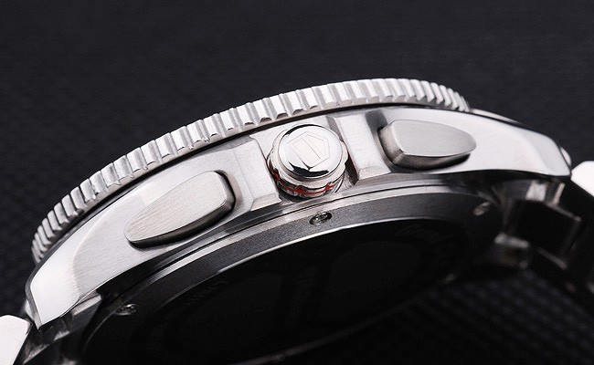 Crown: pulido corona calado de acero inoxidable con logo TAG Heuer más dos coronas adicionales a cada lado y uno en la parte superior opuesta Espesor corner