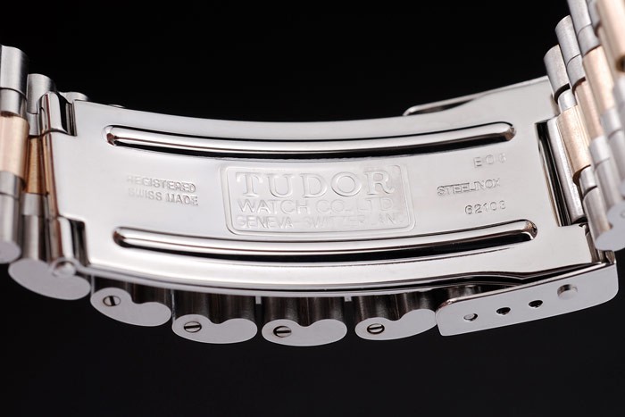 Bracelet: dos tonos de acero inoxidable cepillado y oro amarillo plateado brazalete de eslabones con grabados Tudor y pulsador comunicado de cierre plegable con el logotipo Tudor el top