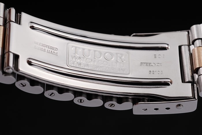 Bracelet: dos tonos de acero inoxidable cepillado y oro amarillo pulsera plateada de enlace con grabados Tudor y pulsador comunicado de cierre plegable con el logotipo Tudor el top